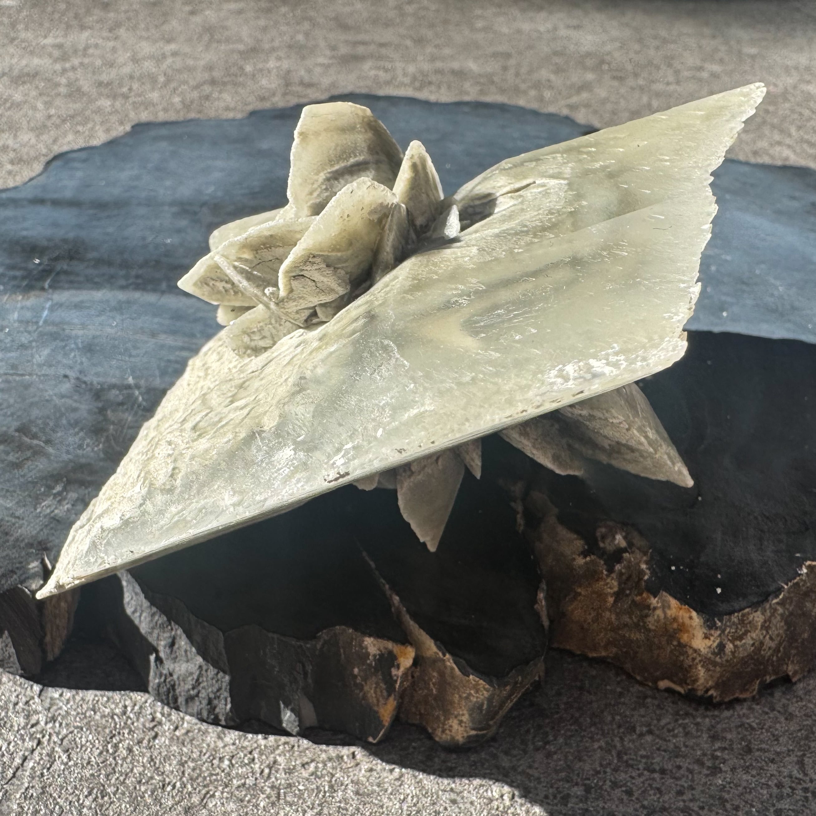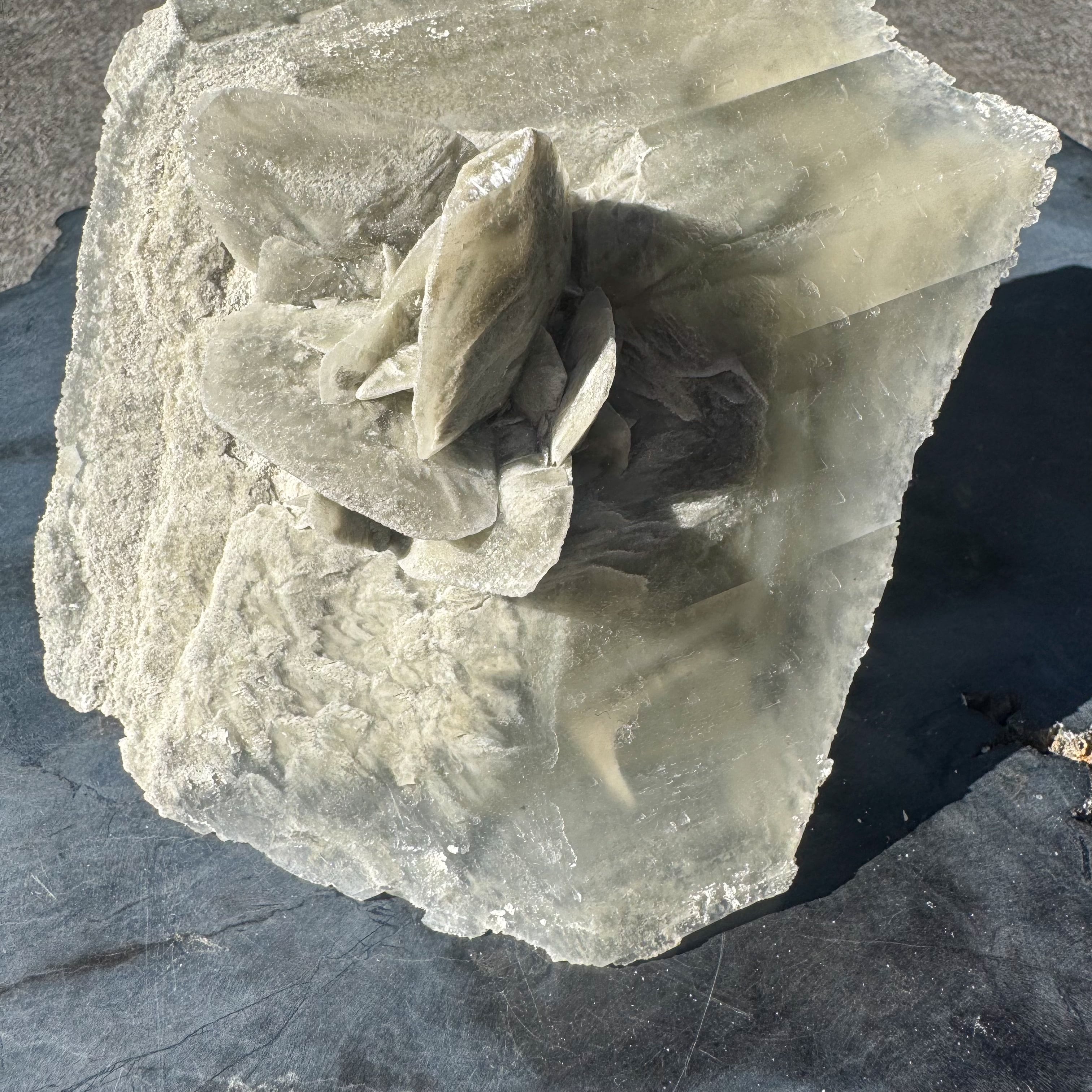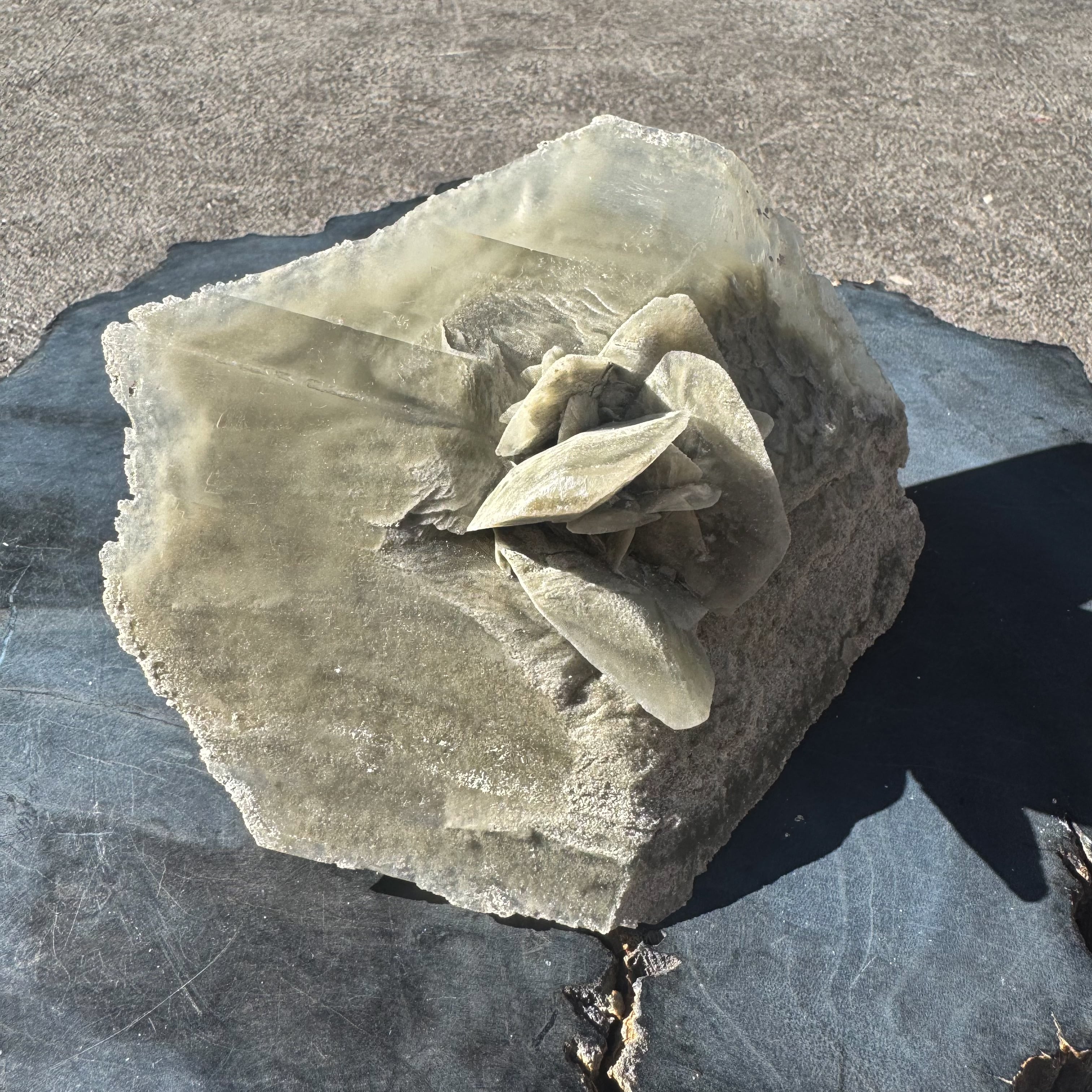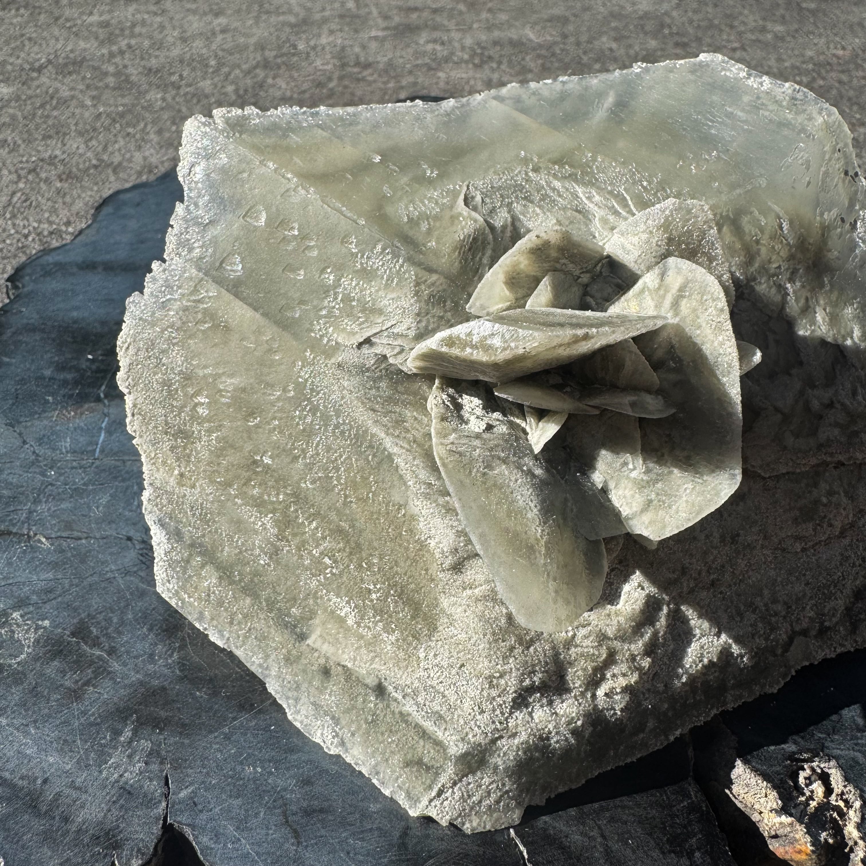 マッドダイヤモンドセレナイトの中でも、中心部に花が咲くような形状のものはとても珍しくオブジェとしての存在感を放ちます。
