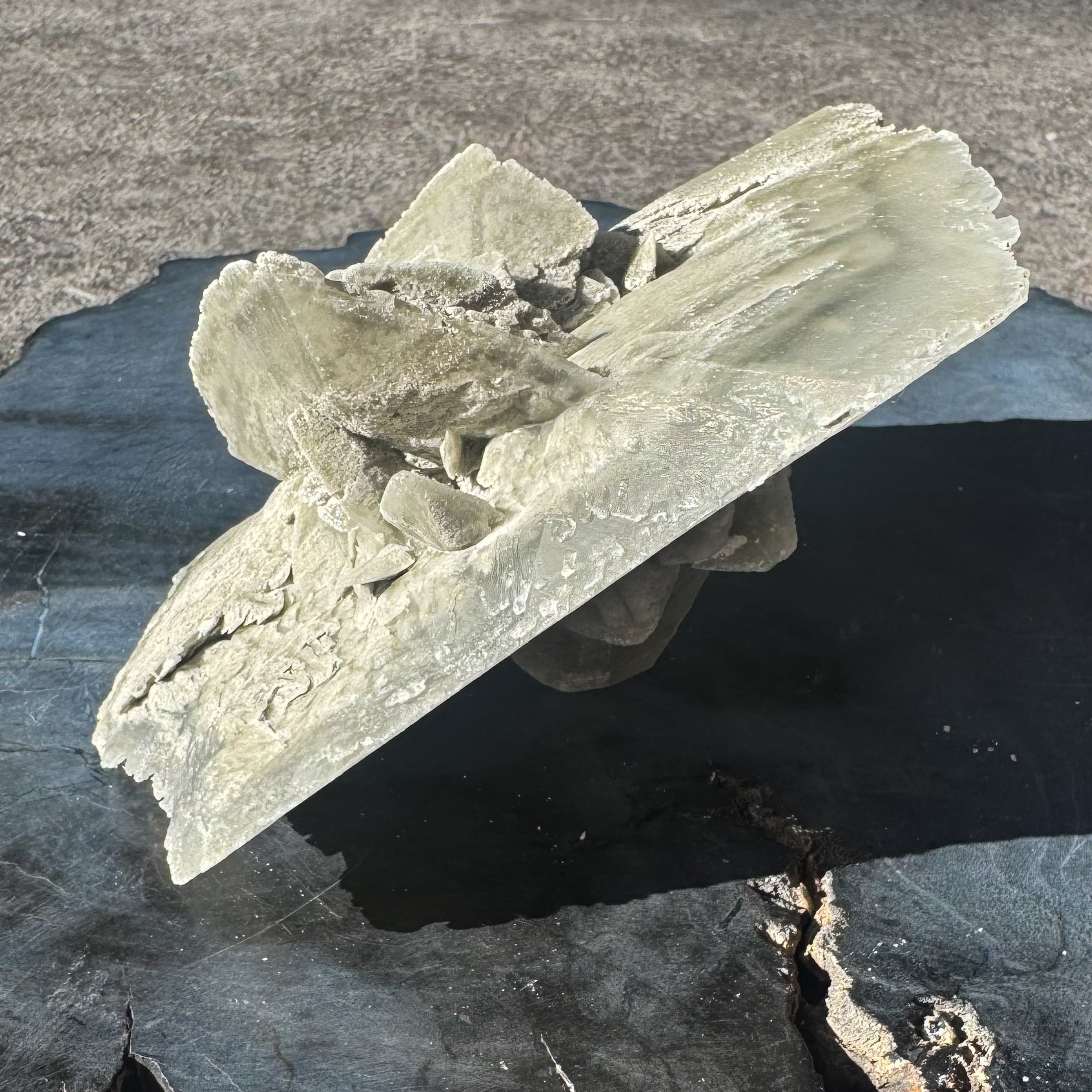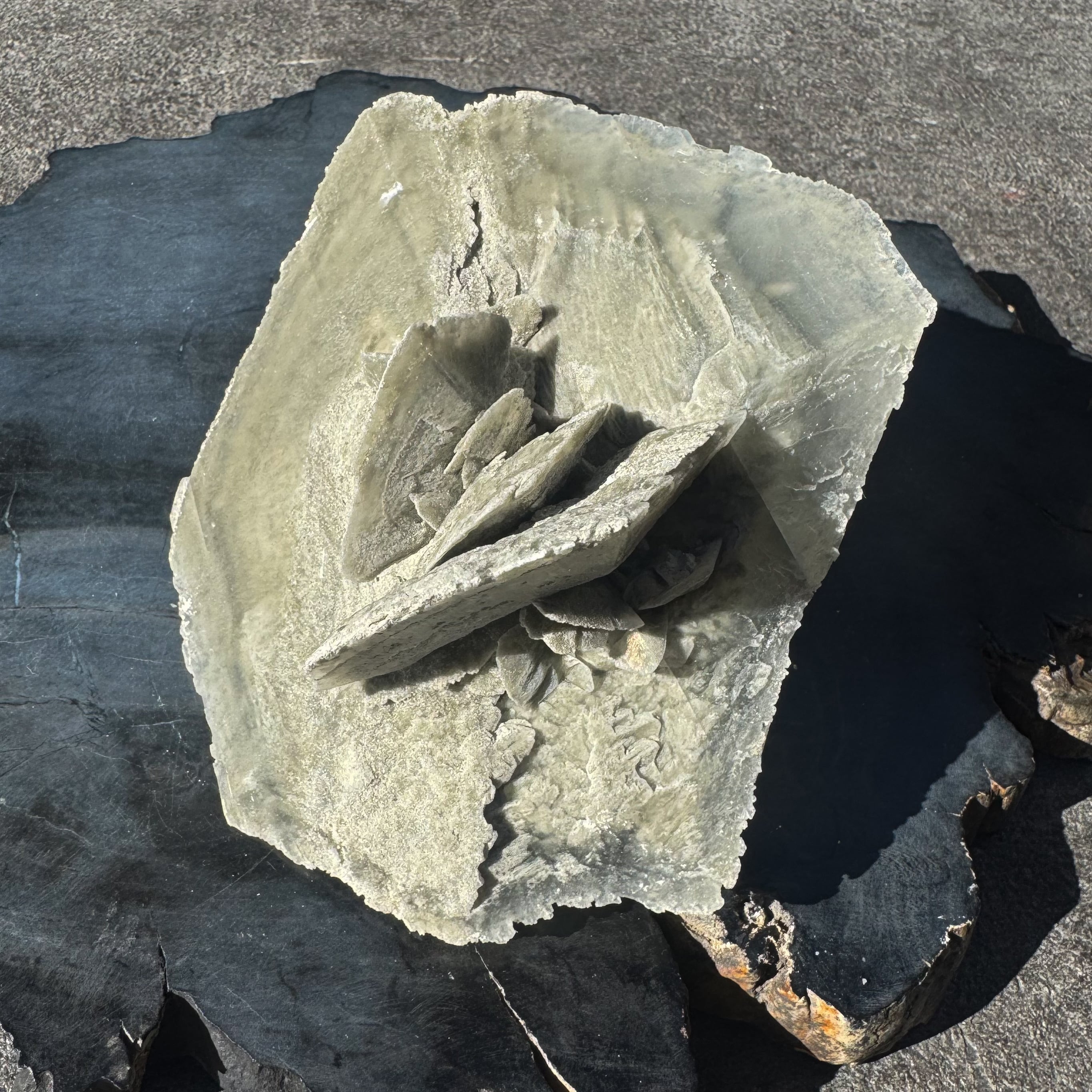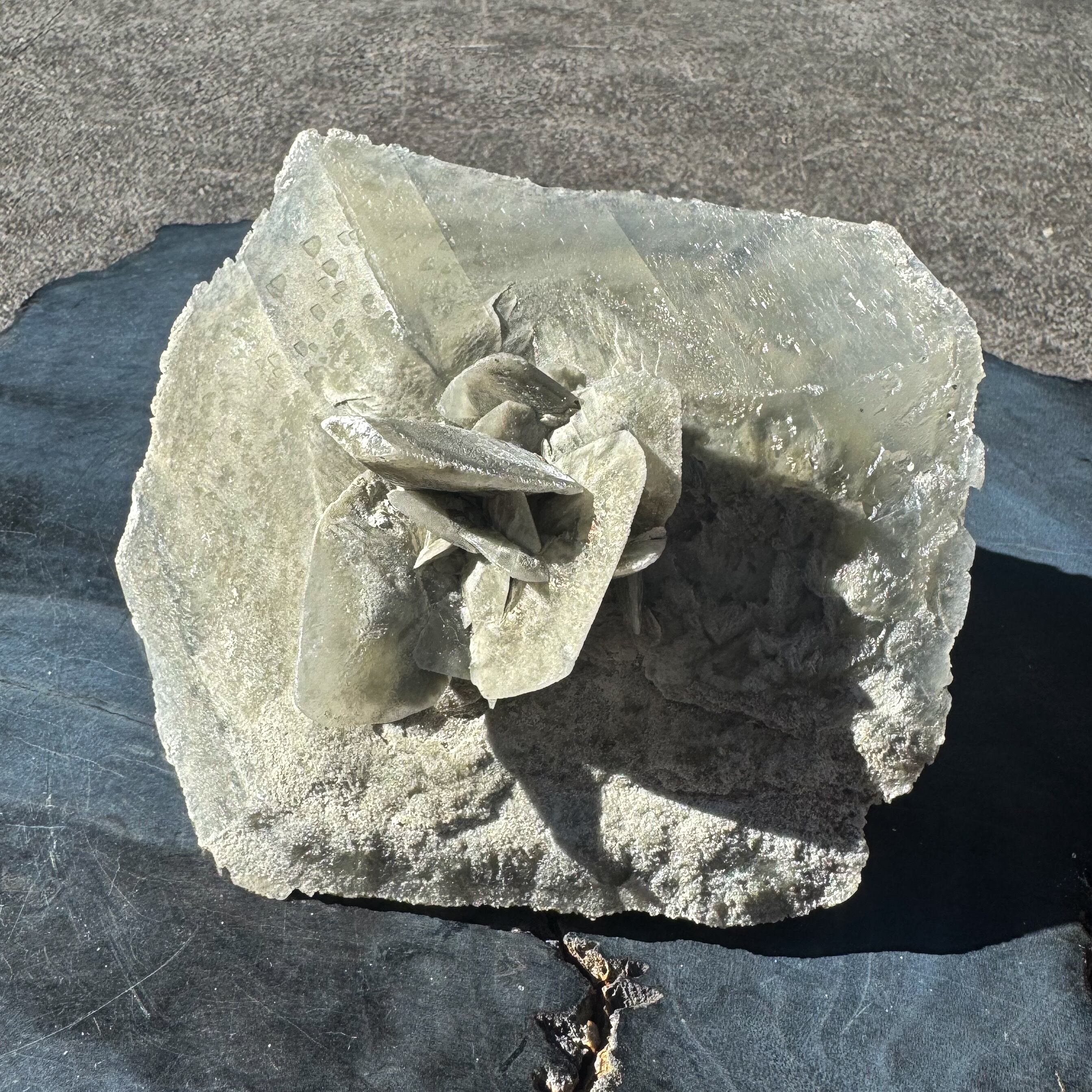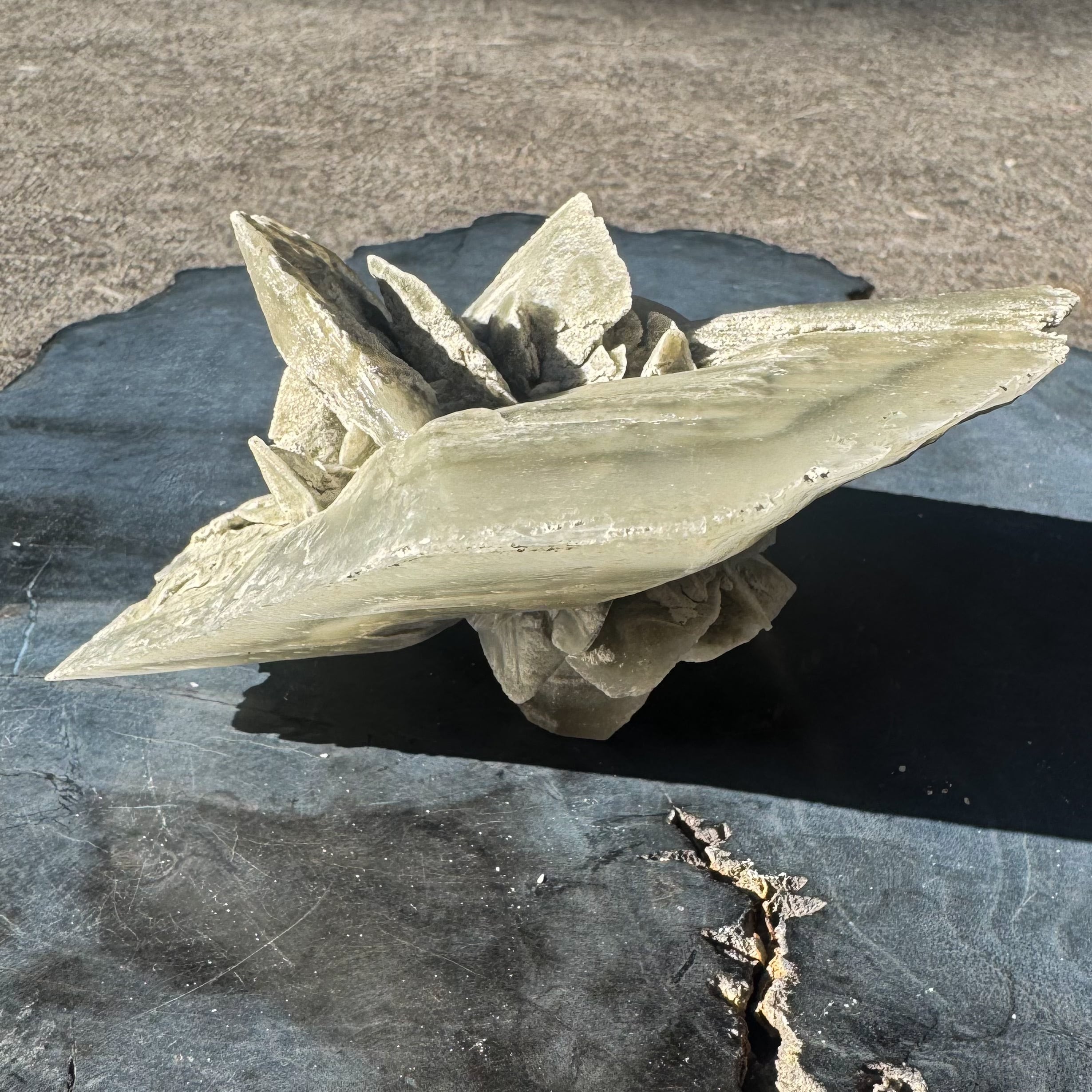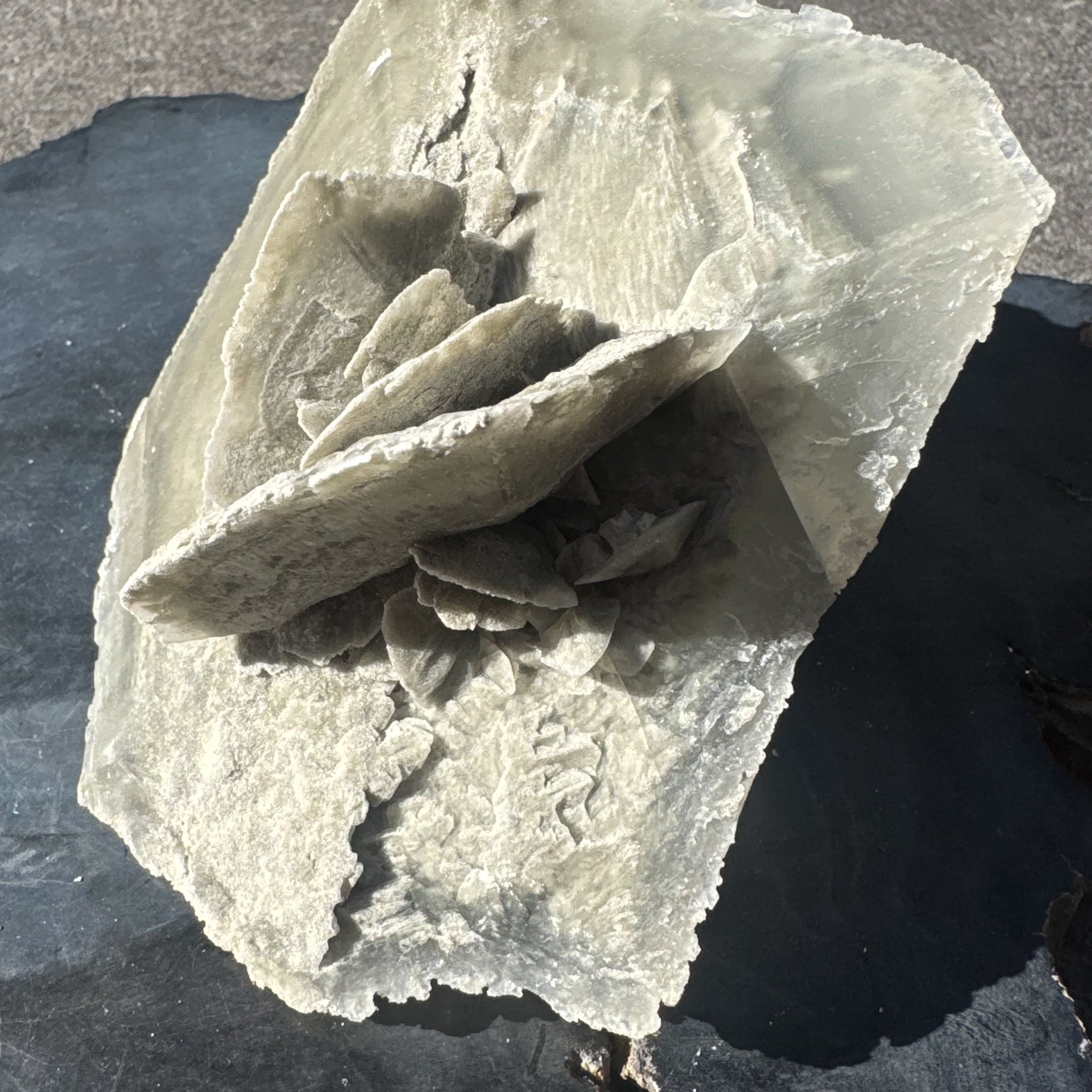 マッドダイヤモンドセレナイトの中でも、中心部に花が咲くような形状のものはとても珍しくオブジェとしての存在感を放ちます。
