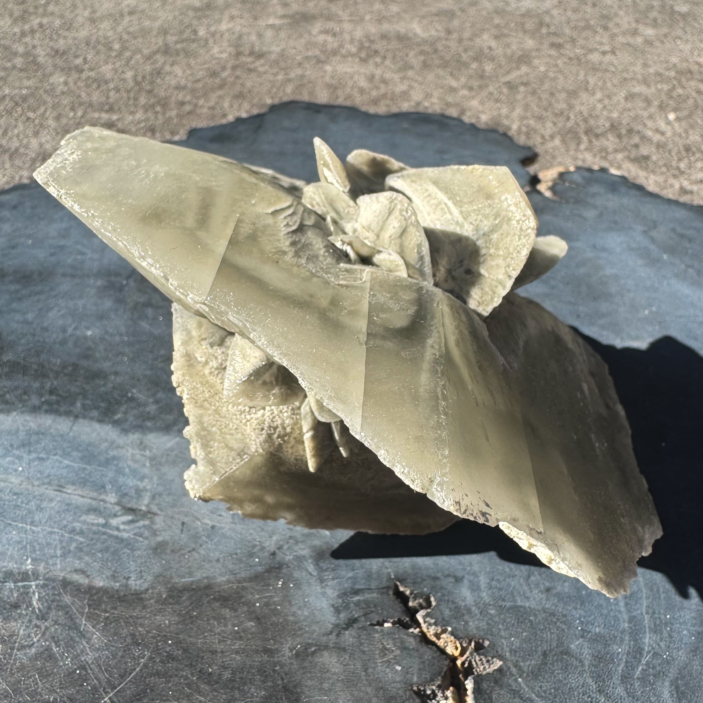 通常のセレナイトは棒状や繊維状が多いですが、これはレンズ状の構造を持ち、それにより菱形に結晶します。