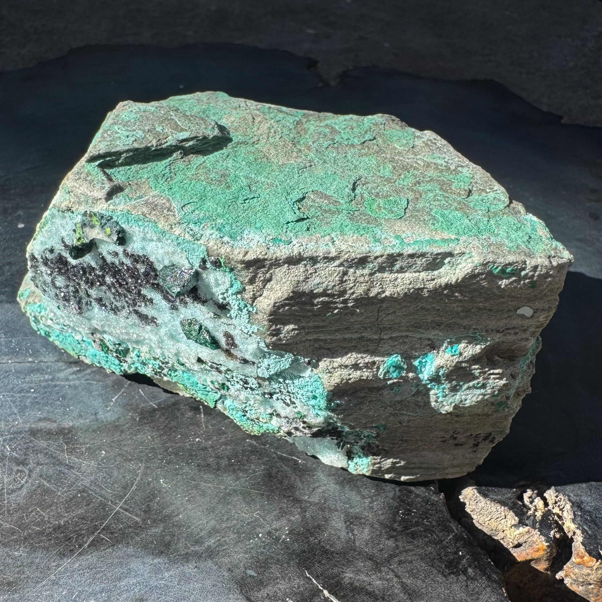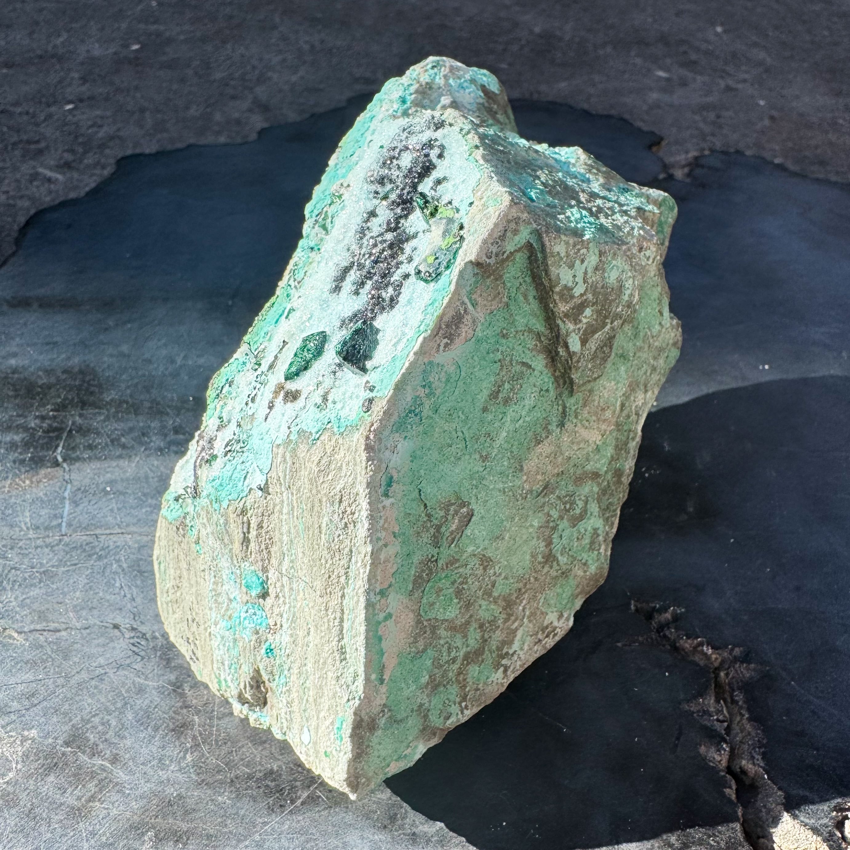 コンゴ産クリソコラマラカイトにヘテロゲナイトが共生した原石をご紹介いたします。