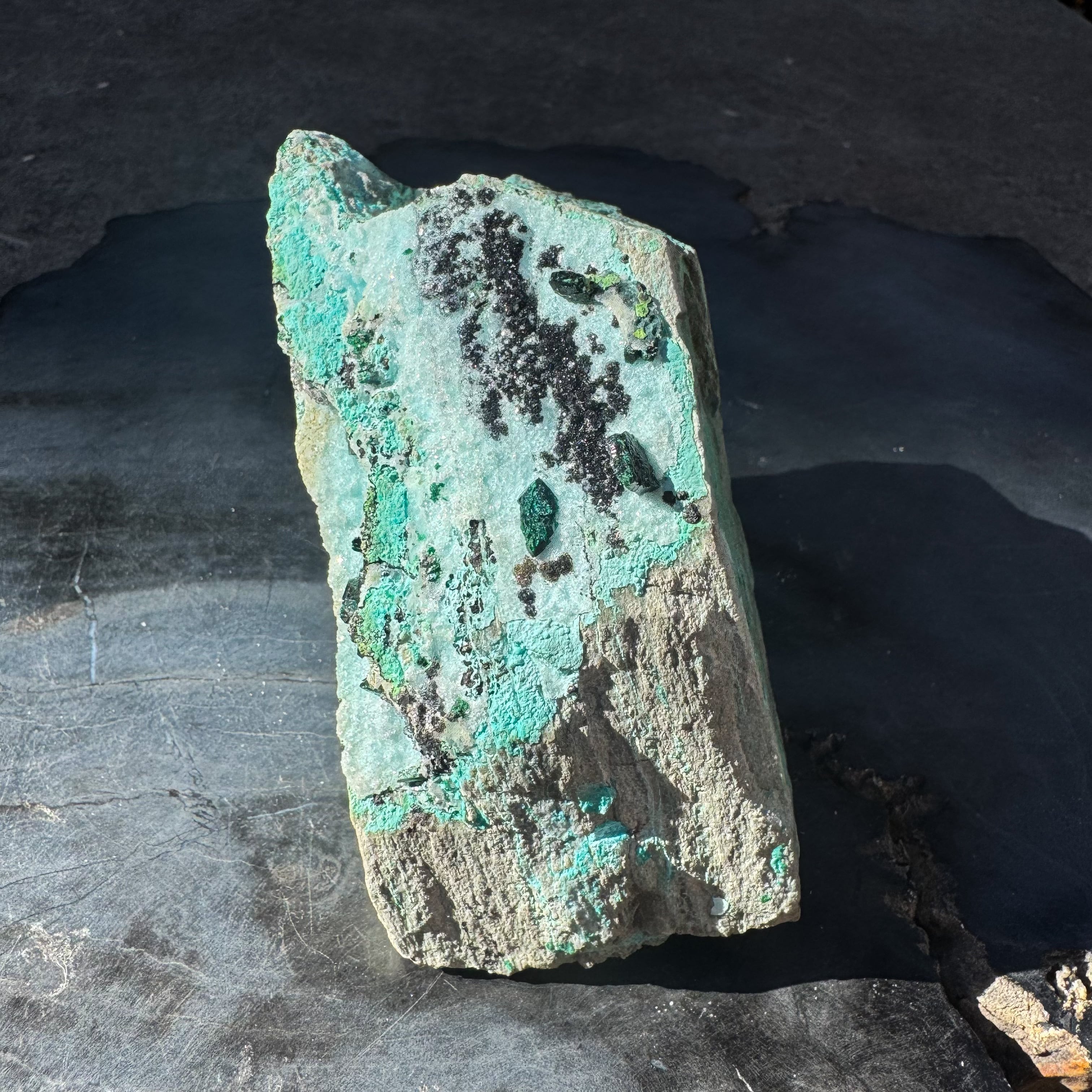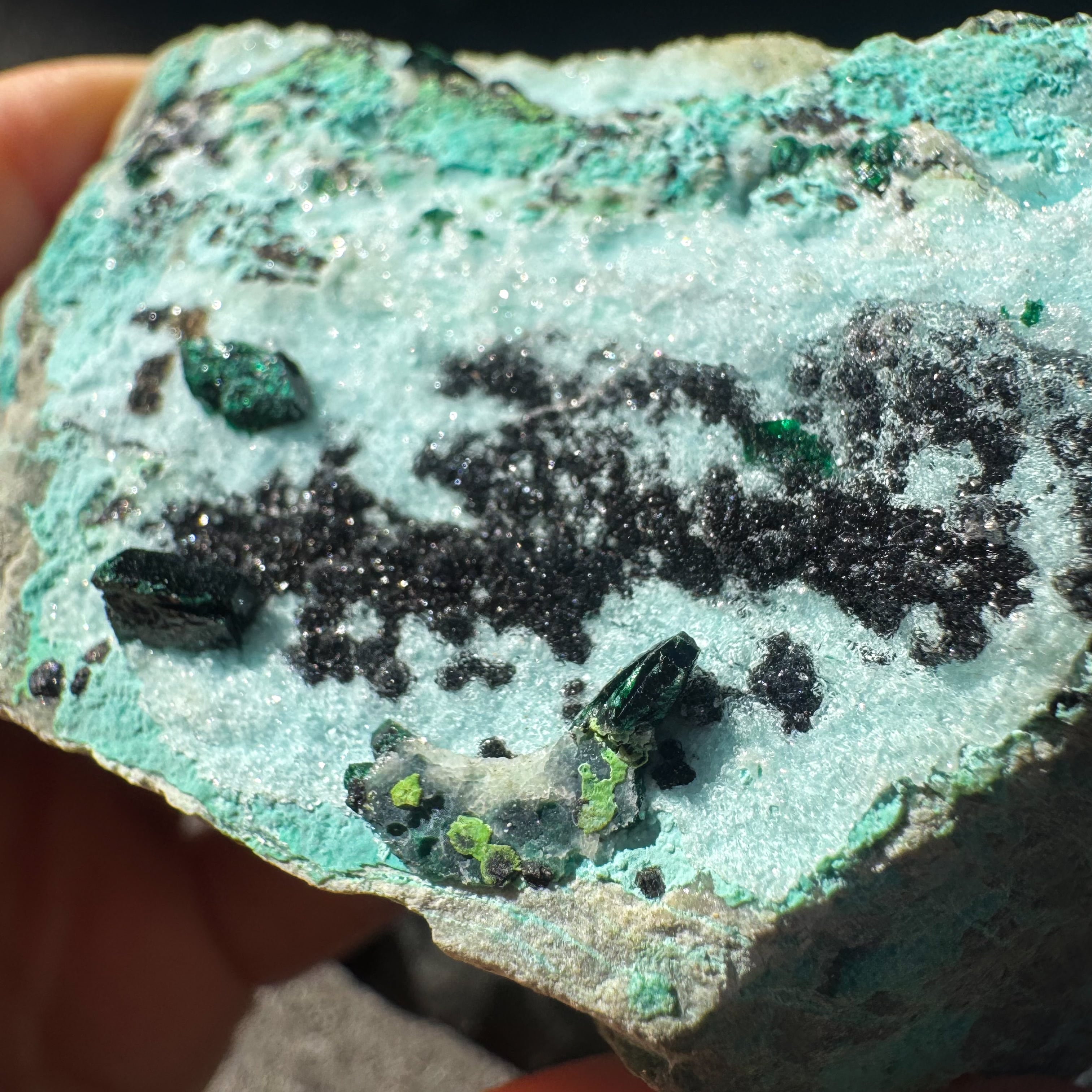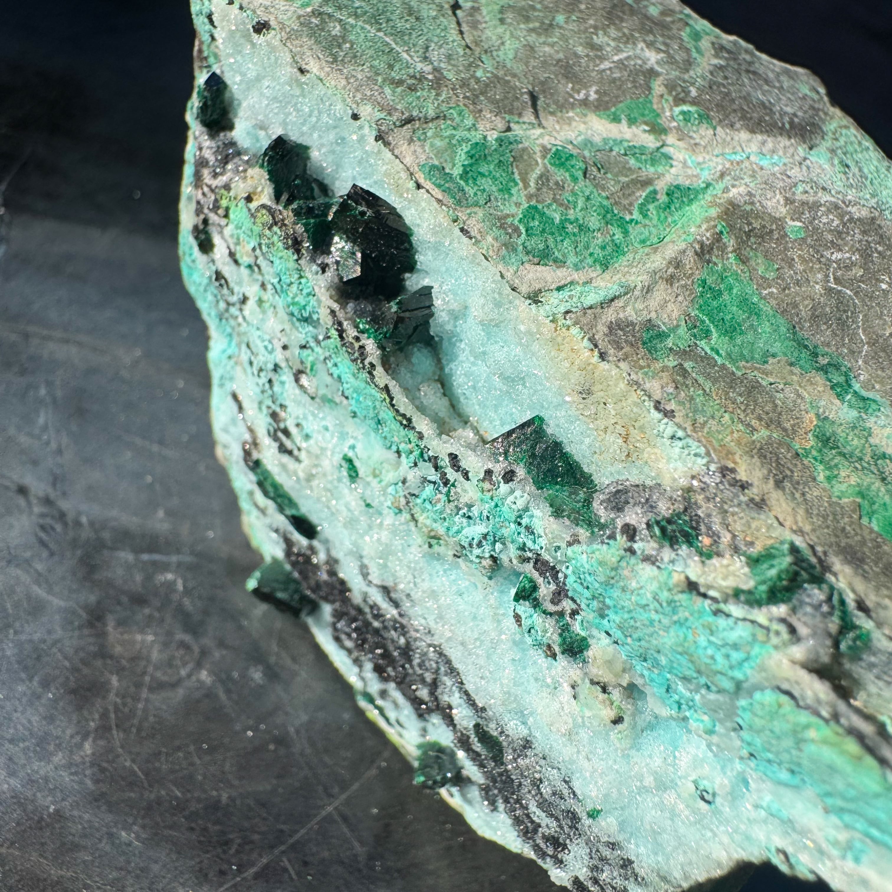 砂糖菓子のようにキラキラと輝くクリソコラに、深いグリーンのマラカイトの結晶が夢見心地にさせてくれるカラーリング。