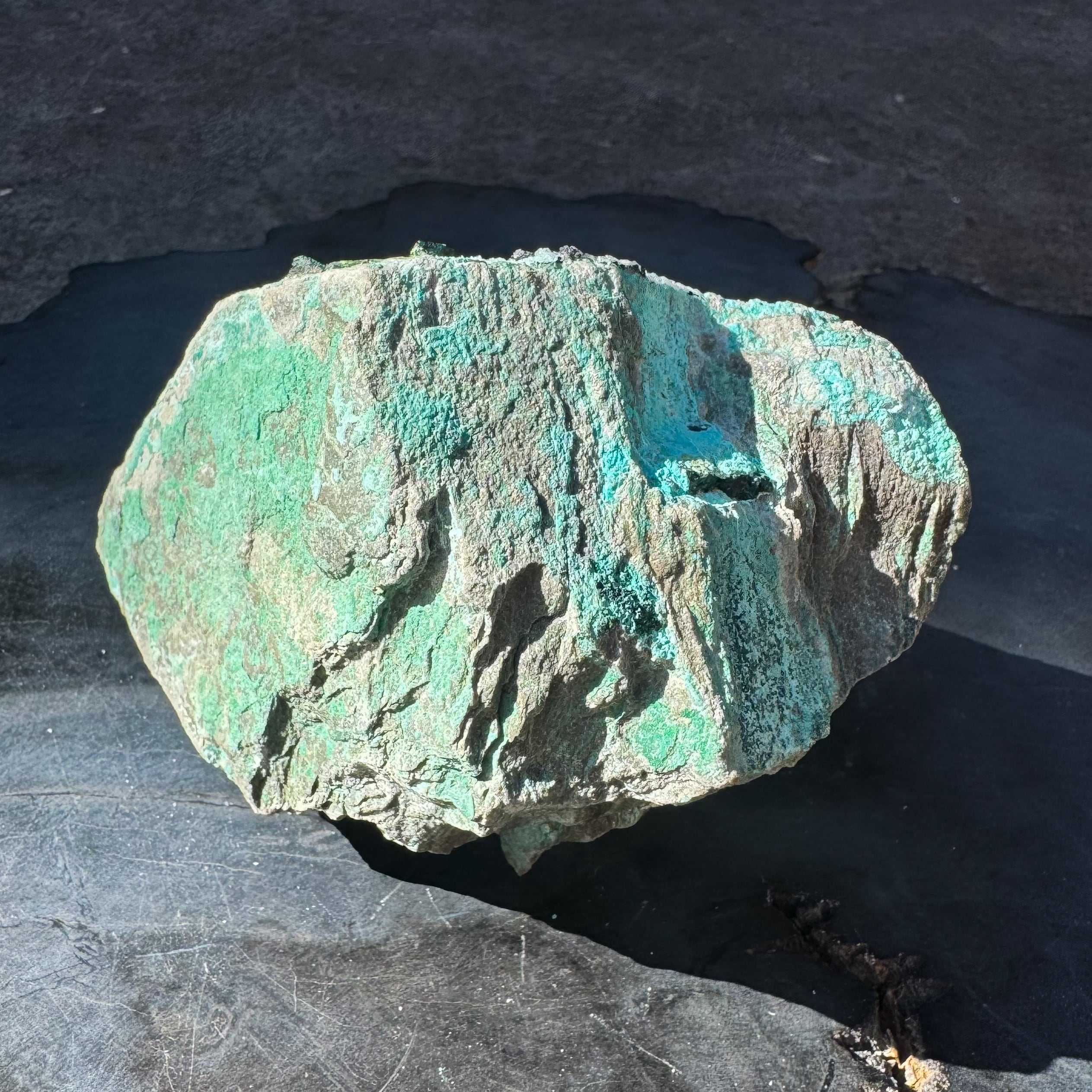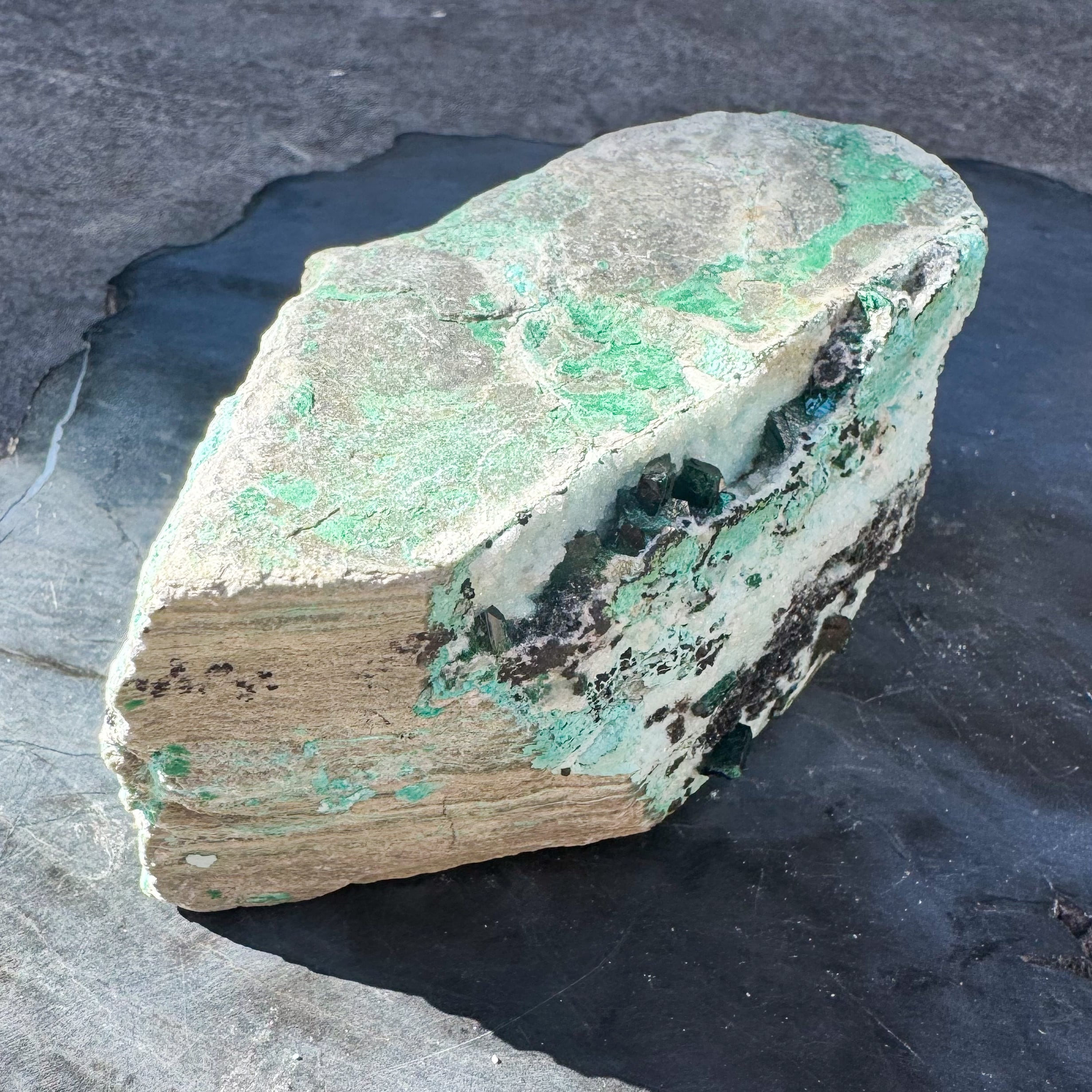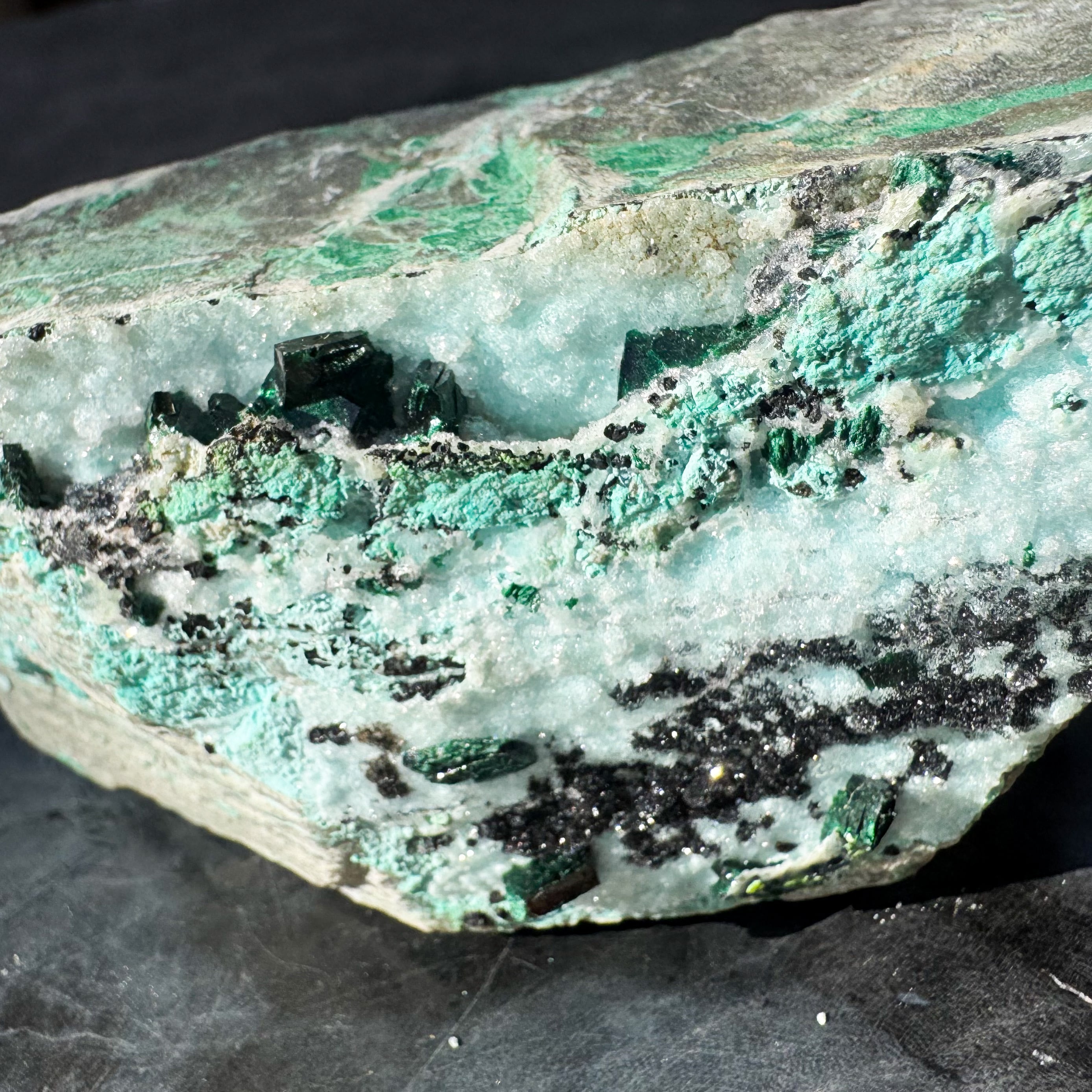 砂糖菓子のようにキラキラと輝くクリソコラに、深いグリーンのマラカイトの結晶が夢見心地にさせてくれるカラーリング。
