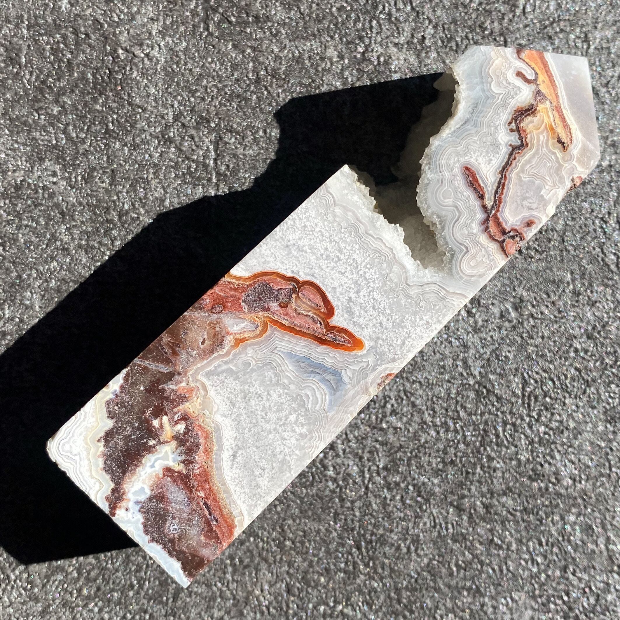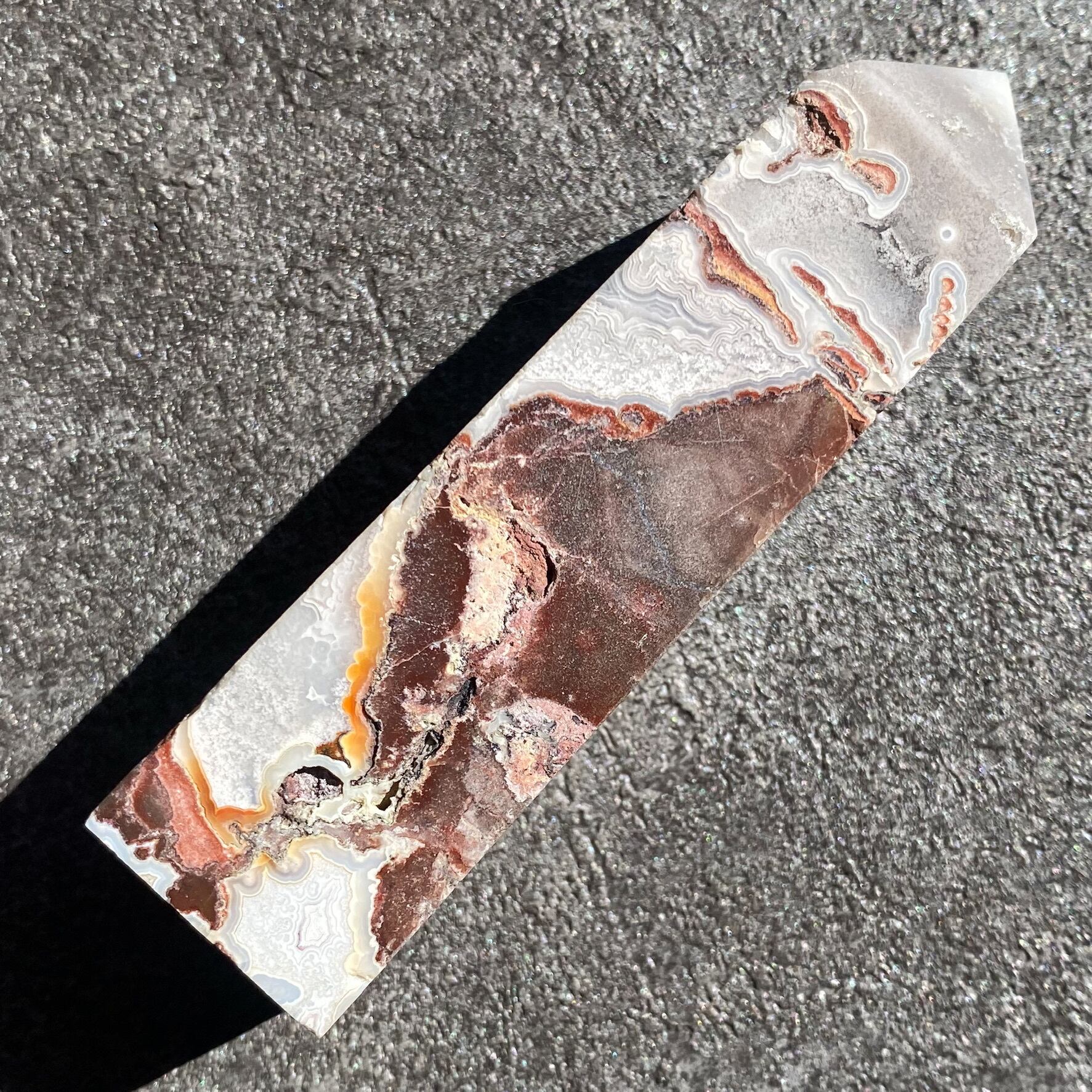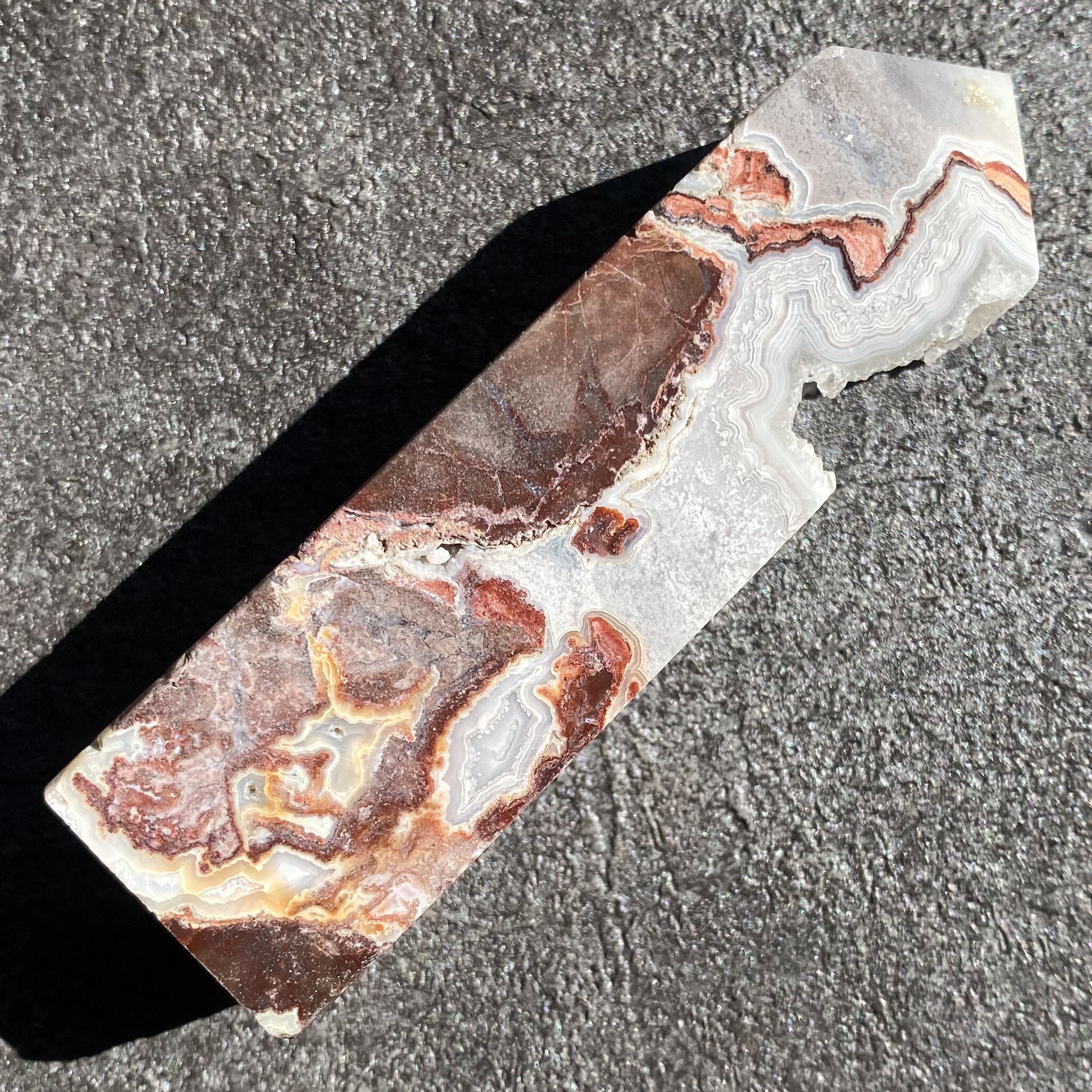 ペン画のような緻密な縞模様と大地を思わせる大胆なカラーリングが特徴のクレイジーレースアゲート。