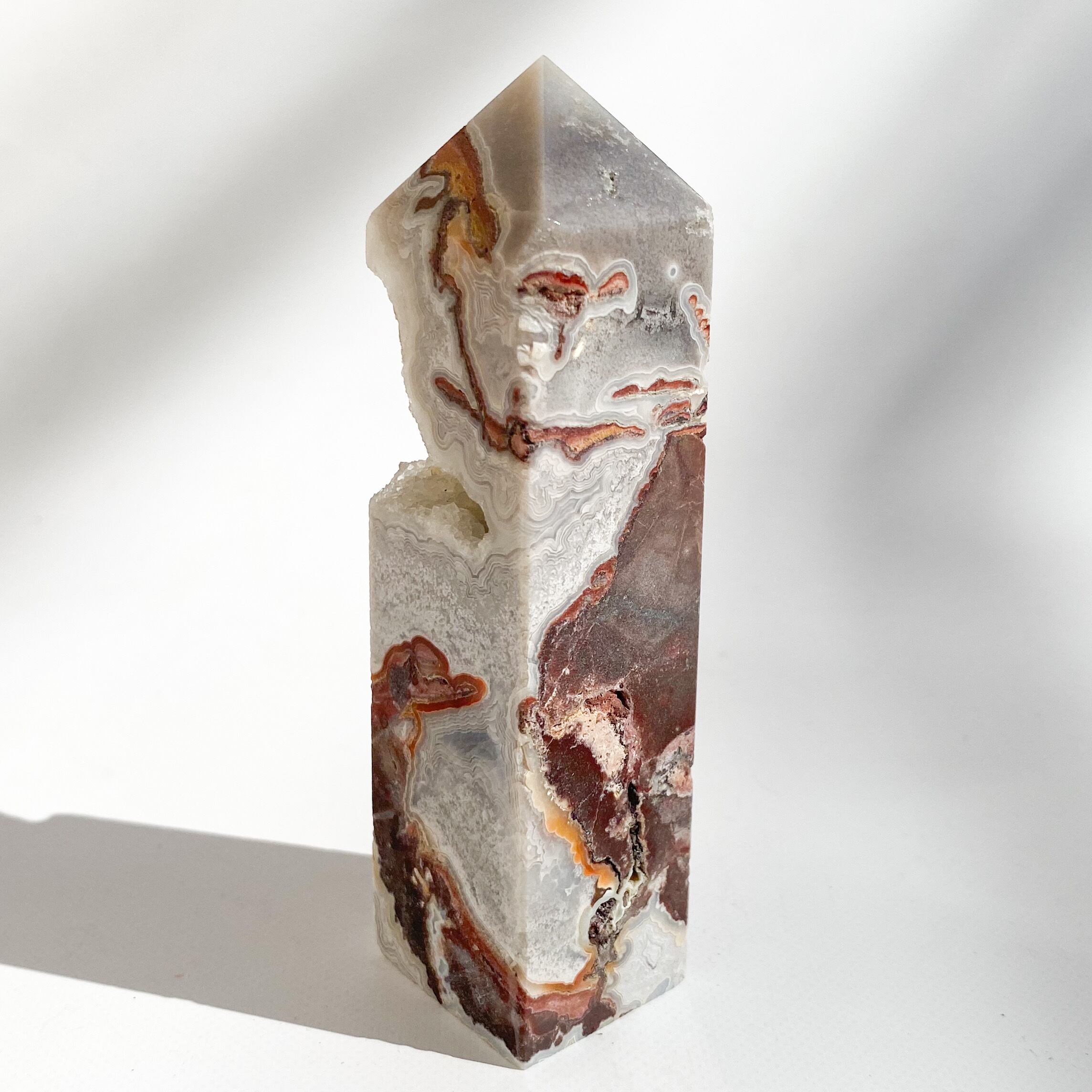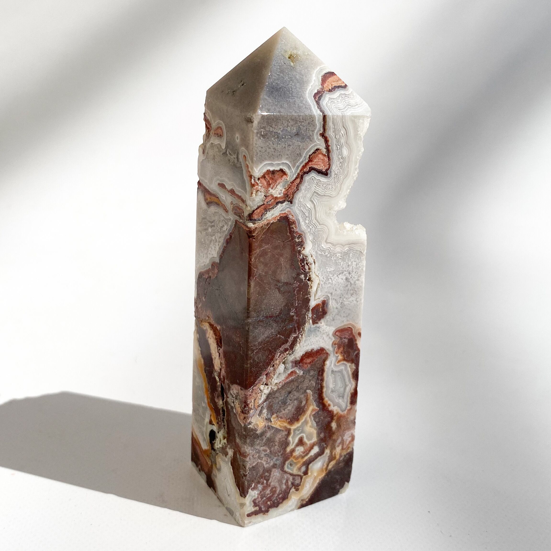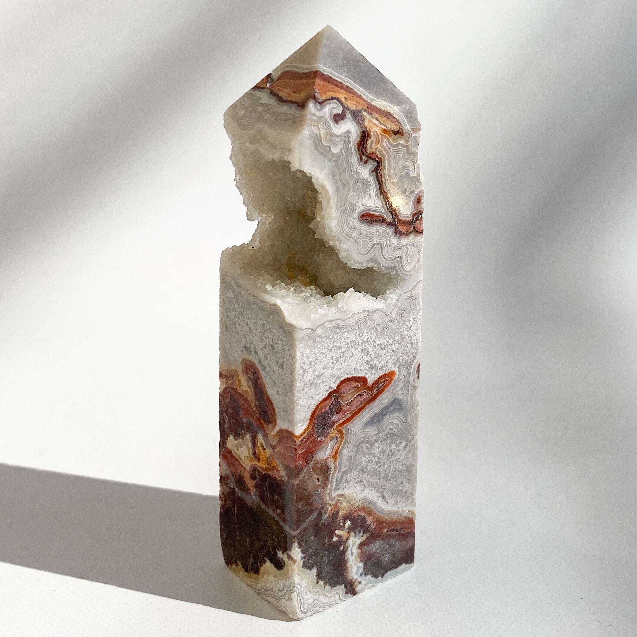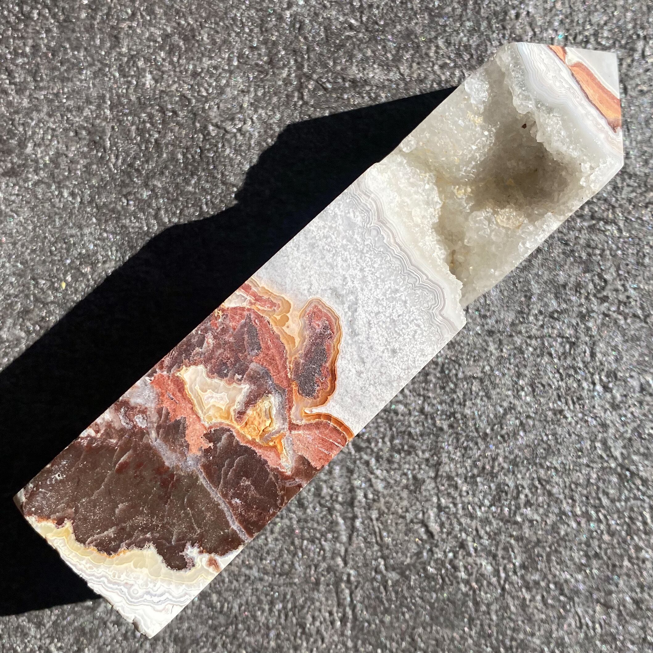 ペン画のような緻密な縞模様と大地を思わせる大胆なカラーリングが特徴のクレイジーレースアゲート。